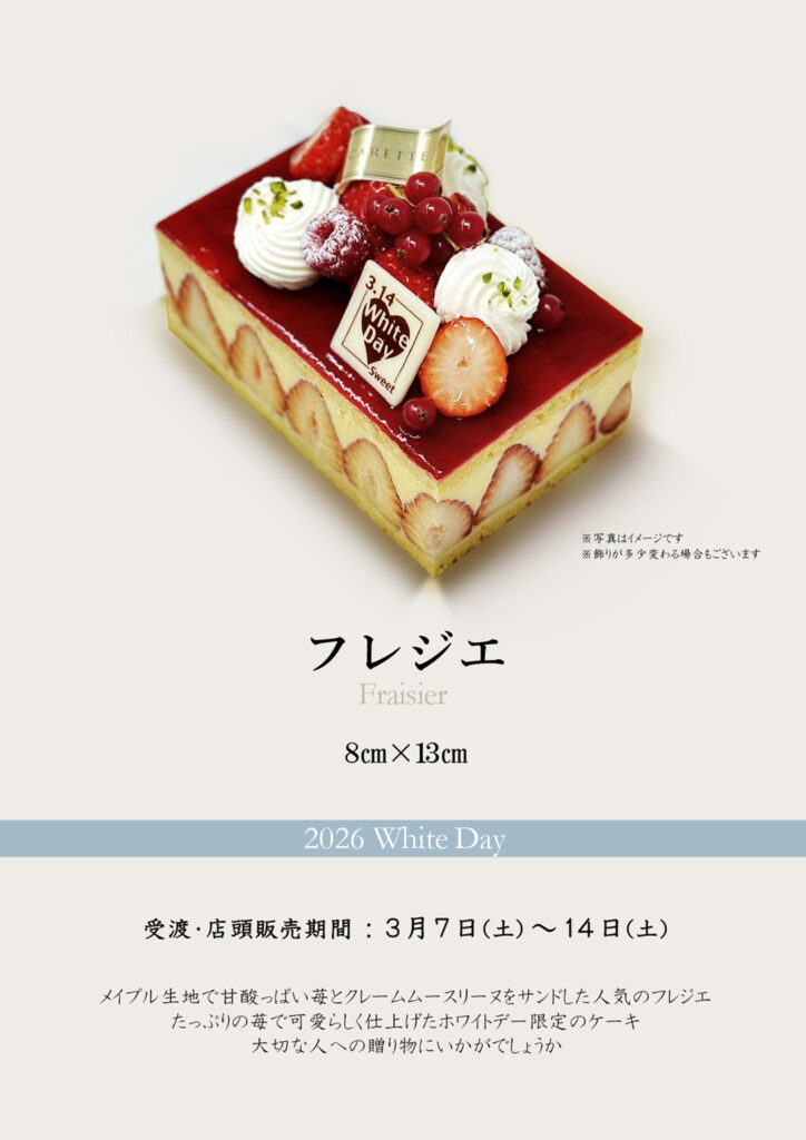 ホワイトデー限定ケーキ の ご予約を承っております美しい断面とたっぷりの苺で人気の “フレジエ”ホワイトデーギフト、大切な人への贈り物にいかがでしょうか